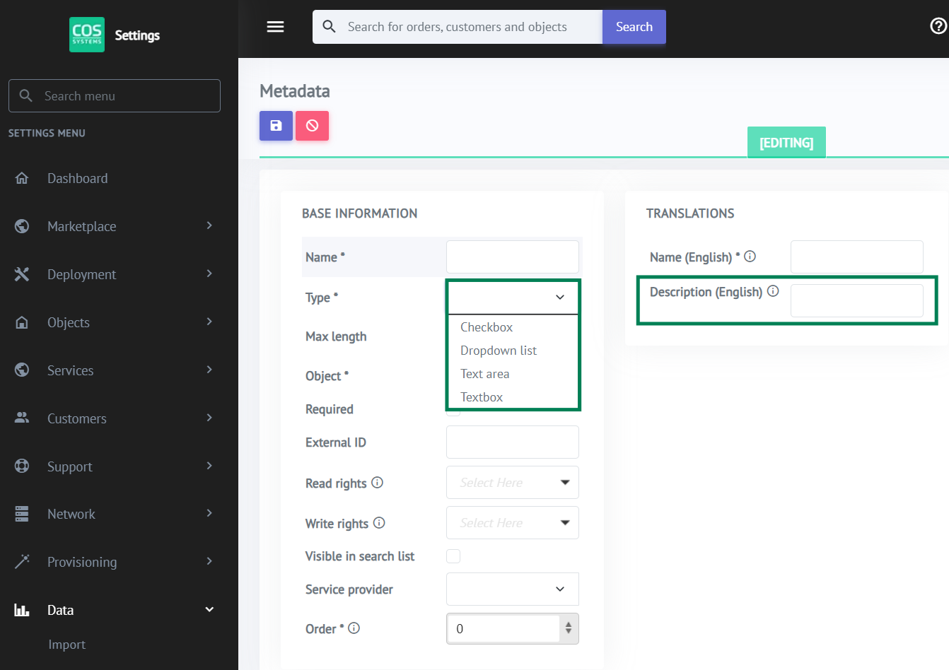 Metadata are additional fields that can be created and connect to for example a service in COS Business Engine. If there is information that is desired in the administration portal or the customer portal, but does not exist in the standard version, you can create a metadata field.