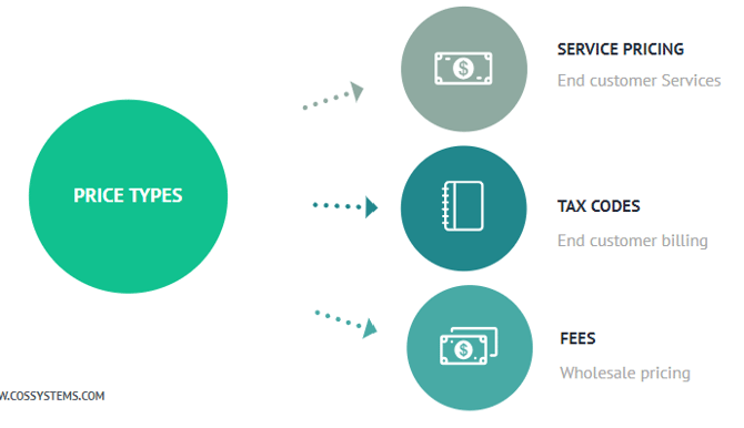 Every Price Type can have their own assigned tax code. You can define the different Price Types if it’s a recurring cost or a one time cost for the end user.