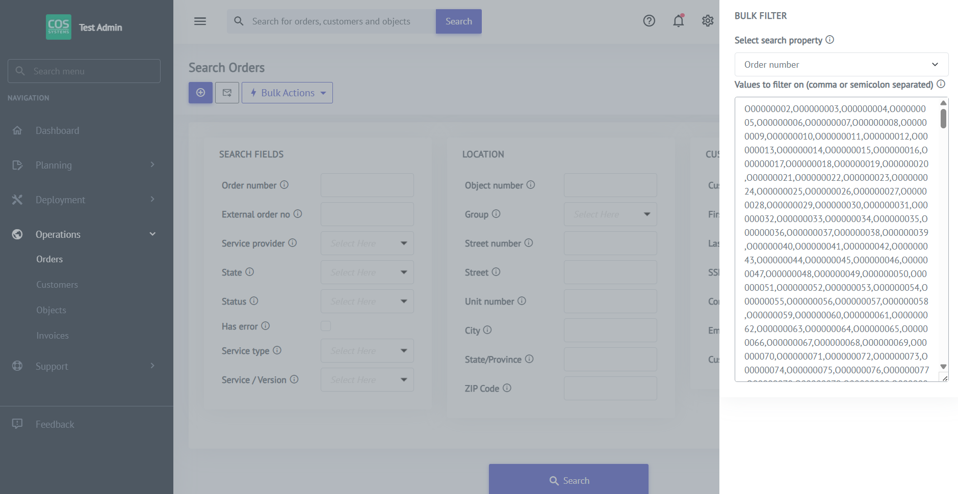 ;). See the example in the image at the bottom of this article. - Note: When entering comma-separated values directly in the search field, there’s a limit of roughly 50 records. For larger searches, use the Bulk filter fly-in, where you can paste multiple search properties to filter the results. Contact COS Support if you want additional values to be available for filtering.