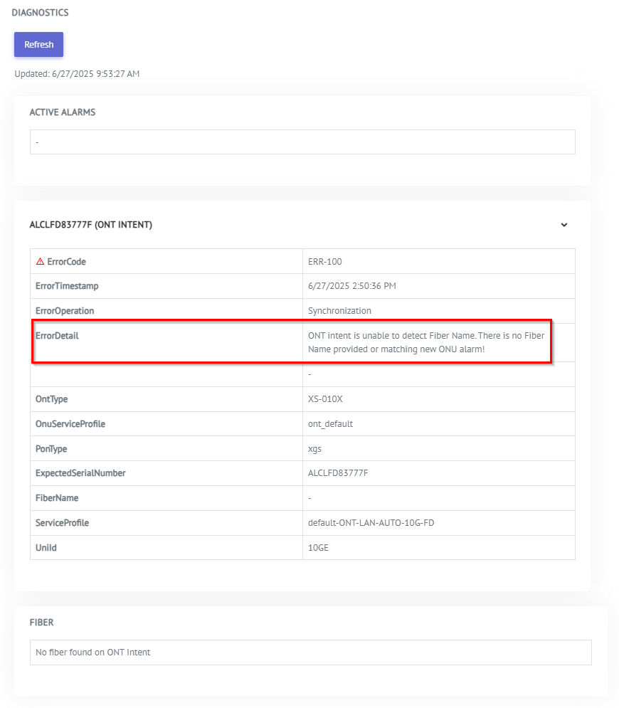 Review the ErrorDetail field within the Diagnostics fly-in to identify any error messages related to the fiber name.