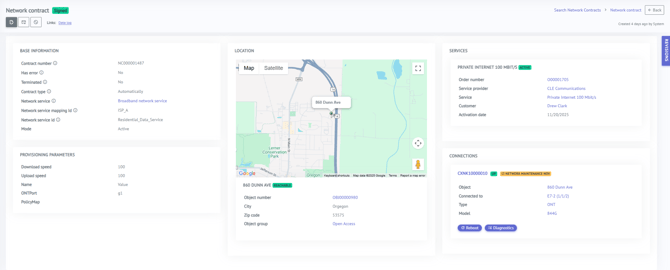Network Contracts show the exact link between an order and the network—what service is being activated, which network element and port are used, and whether provisioning is automatic or manual. They also display provisioning status and any errors, making them a key tool for diagnosing service issues.